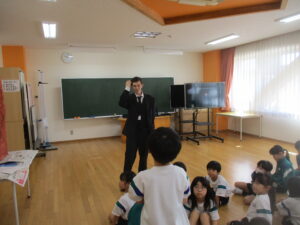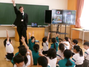 交流活動では、ギャレット先生から日本の小学校とアメリカの小学校の違いについて、クイズ等を交えながら楽しくお話ししていただきました。