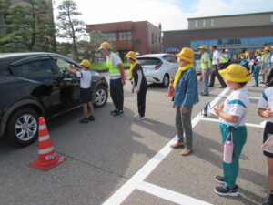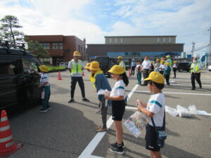 また、午後には大島コミュニティセンター前で、代表児童が「交通事故へっちまえ運動」の一環として、へちま水を運転手さんに配りました。