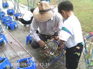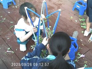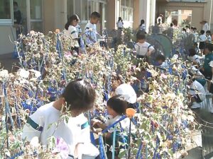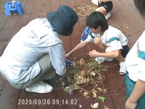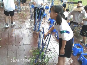 支柱に巻き付いたつるを外すのに子供たちは大苦戦・・・ しかし、友達と協力してなんとか最後はきれいにつるを外すことができました。「14歳の挑戦」で大島小学校に来ているお兄さん・お姉さんや学校応援ボランティアの方々にも手伝っていただき、子供たちはとても嬉しそうでした。