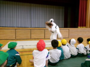 また、柔道連盟の先生方による迫力満点の投げ技も披露されました。目の前で見るダイナミックな技の数々に子供たちからは、「かっこいい!」「すごい!」と大きな歓声と拍手が上がっていました。