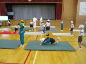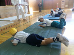 教室では柔道の基本である「受け身」を教えていただきました。子供たちは、転んだときにどうすれば頭や体が守れるのか、安全な手の付き方や受け身をマットの上で練習しました。初めは恐る恐るだった子も、先生方の丁寧な指導で、上手に受け身をとれるようになりました。