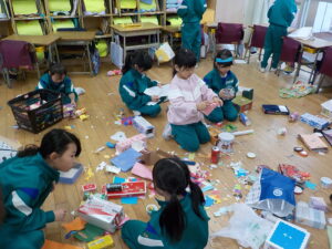 3組は箱や色画用紙を使って仮装をしました。カラフルなおばけたちをつくるなど、おもしろいものをたくさんつくってみんなで楽しみました。