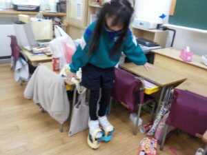 1組と2組は新聞紙を使って、仮装をしました。工夫を凝らして、マントやお面をつくりました。牙をつけたドラキュラや新聞紙を巻き付けたミイラ、帽子をかぶり、ほうきをもった魔女、お寿司屋さん等に変身する子供がおり、ユニークで楽しい時間になりました。