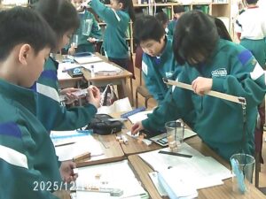 算数科では、自作てんびんを使い、重さを比べる活動を行いました。