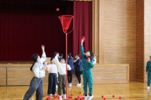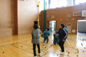 綱登り、玉入れ、バドミントン、平均台の4つの競技を行いました。たくさんの子供たちが参加し、失敗しても何度も挑戦する姿や、全ての競技を制覇しようと取り組む姿が見られました。