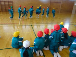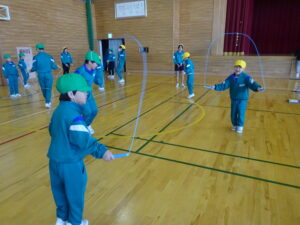 また、6年生に手本を見せてもらいました。縄を回す速さや跳ぶ速さにびっくりした1年生でした。