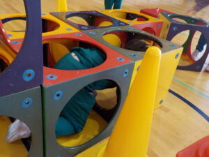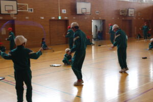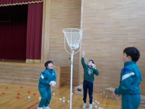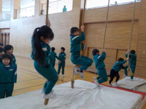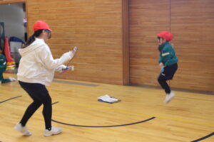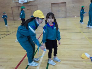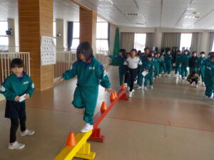 下学年の部では、綱登り、バドミントン、玉入れ、平均台、迷路の5つの種目を行いました。上学年の部に引き続き、たくさんの子供たちが参加し、何度も挑戦したり、様々な種目のコーナーを友達と一緒に回ったりするなど楽しそうな様子が見られました。