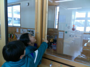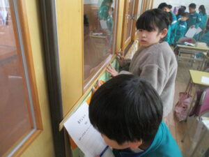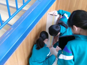算数科「長いものの長さのたんい」の学習で、1メートル物差しや子供たちがつくった3メートル物差しを使い、学校内のさまざまな場所や物の長さを測りました。「ここは何メートルあるのかな?」「思ったより長い!」「3メートル物差しだとすぐ測れるね!」と、友達と声をかけ合いながら、楽しんで活動する姿が見られました。