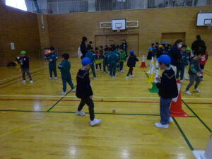 交流会では、なかよしあそびと学校探検を行い、1年生が年長の皆さんをリードして様々な遊びを教えたり、学校を案内したりしました。