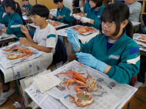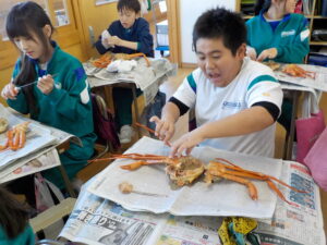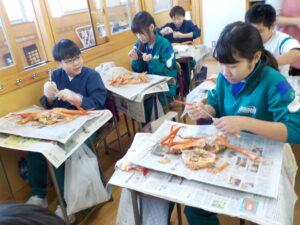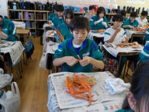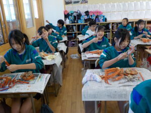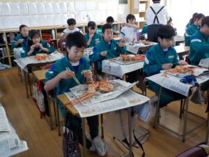 射水市の特産物を知ってほしいという願いから新湊漁協から無償でいただいていることや、射水市の6年生だけ食べることができること等を知り、感謝して食べようという様子が見られました。