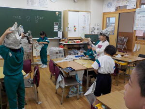 1組と2組は新聞紙を使って、仮装をしました。工夫を凝らして、マントやお面をつくりました。牙をつけたドラキュラや新聞紙を巻き付けたミイラ、帽子をかぶり、ほうきをもった魔女、お寿司屋さん等に変身する子供がおり、ユニークで楽しい時間になりました。