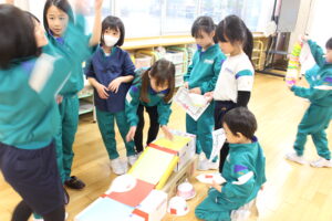 2年生は、1年生に楽しんでもらえるよう、工夫を凝らした手づくりのおもちゃづくりに取り組んできました。材料の選び方や遊び方の仕組みを何度も見直し、よりよいものにしようと試行錯誤を重ねました。